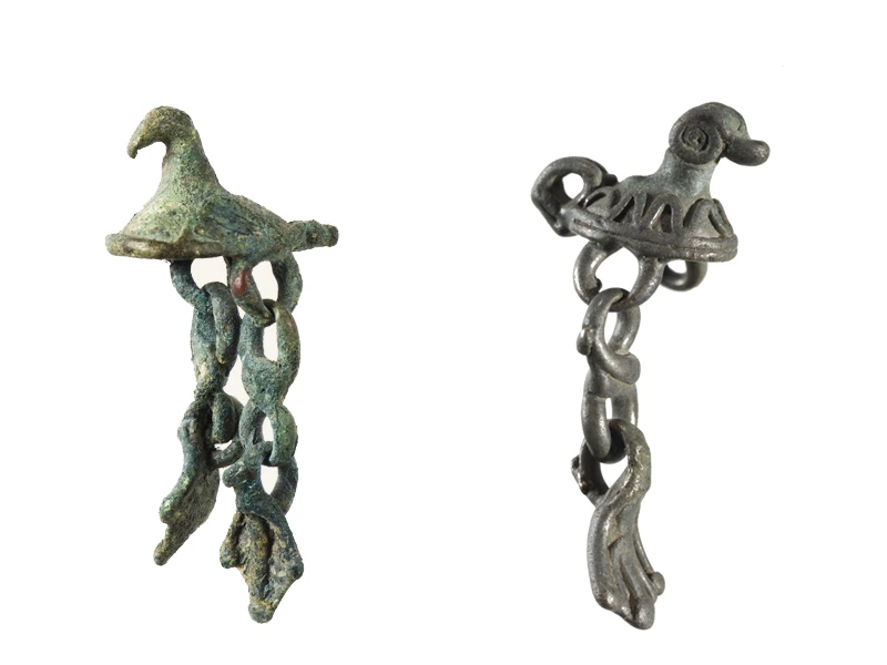 Подвески - лошадкиНа самом деле, эта странная лошадь с шестью утиными лапами и двумя головами вовсе не конь. Амулет является стилизованным изображением традиционной лодки. Лошадиные головы — это штевни, а лапки или колокольчики на цепочках – это весла. Иногда встречаются очень длинные лошадки, с множеством весел. Забавная деталь: возможно, зигзаг на боку лошадки символизирует закрепленный на лодке груз.