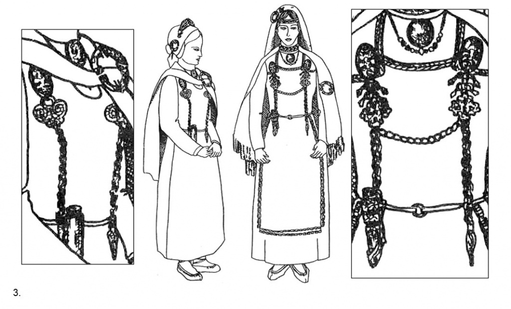 Это максимально похоже на современную реконструкцию одежды финно-угорских племен. Тут есть и пуукко (нож), в характерном чехле и наплечные накидки, и фибулы, и большие круглые застежки. С небольшим уточнением, что на груди носили не монисты, а цепочки, но тут могут быть трудности перевода.