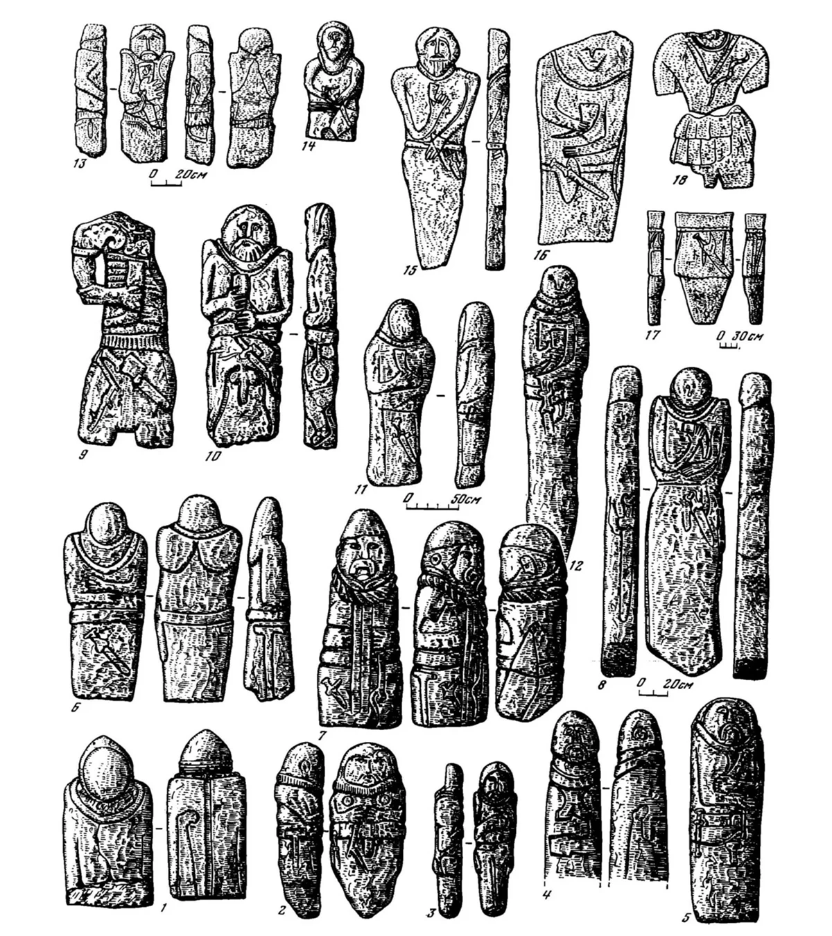Скифские каменные изваянияСкифы, а затем сарматы имели широкие культурные и торговые связи с волжскими финно-угорскими племенами. Это нашло свое отражение в греческих письменных источниках. В V в. до н.э. Геродот, описывая торговые маршруты скифов и греков, рассказывает о сухопутном пути к племенам фиссагетов (греч. Θυσσαγέται - почитающие жертвоприношения) и иирков (праур. *irkä, фин. yrkä – жених). Академик Рыбаков, в своей монографии "Геродотова Скифия", убедительно доказывает, что фиссагеты - это предки мордвы, а иирки – носители дьяковской археологической культуры.