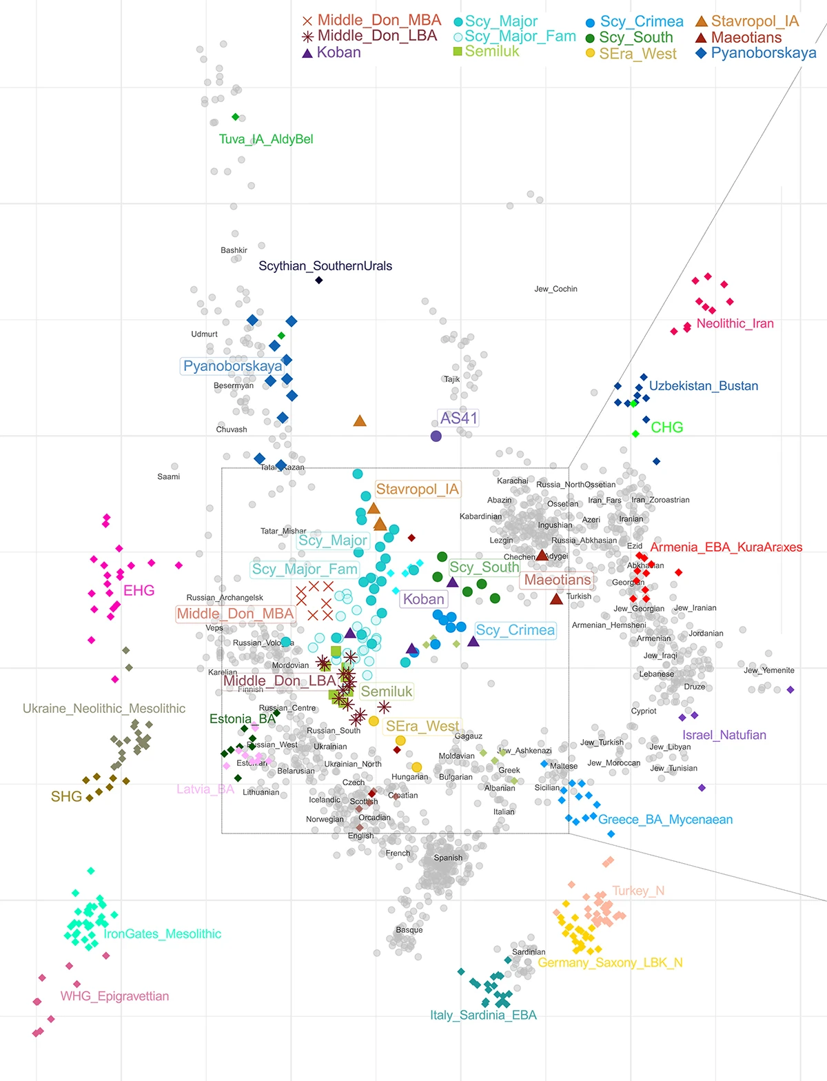 Кластер скифов Scy_Major и Scy_Major_Fam (Донские скифы) пересекается с кластером Russian_Vologda (обрусевшие потомки веси и мери). Tatar_Mishar это потомки летописной мещеры и татар.Финно-угорские народы всегда были крайне малочисленными, поэтому всячески приветствовали и поощряли экзогамные браки. Сейчас это выражается в том, что генетическое многообразие финно-угорской популяции, численность которой измеряется тысячами человек, вполне сопоставимо с многообразием многомиллионных славянских народов. На всякий случай уточню, что на схеме генетических расстояний многообразие выражается в размерах кластера.
