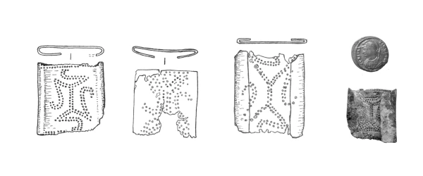Монеты и тамги с раскопок дьяковских городищВ археологических памятниках дьяковской культуры попадаются находки, так или иначе связанные с кочевниками. В поздних слоях часто находят тамги – родовые знаки кочевников. Встречаются византийские и римские монеты. Кроме того, происхождение некоторых женских украшений финно-угорских народов исследователи связывают со скифским наследием.