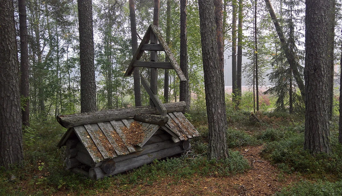 Второй вариант немного загадочный для меня. Археологи описывают его как короб с прахом на поверхности земли. Исходя из этнографии и здравого смысла я предположу, что короб чем-то накрывали, иначе звери сразу растащили бы останки. Накрывать могли лодкой или небольшим деревянным домиком. Такой вариант погребения хорошо известен у карел.