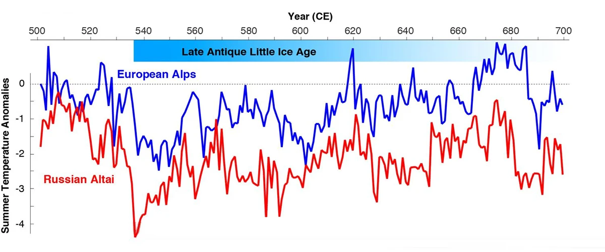 Климатический минимум раннего СредневековьяУсловно в 375 году н.э. начинается климатический минимум раннего Средневековья. Это сильное похолодание по всему миру, с пиком зимой 535/536 года. Климатические изменения происходили плавно, но тем не менее привели к катастрофическим последствиями для всего человечества. Главным образом это был массовый голод (например, в 536 – 537 годах погибло 85% населения Северного Китая), миграции народов (готы, славяне, гунны) и эпидемии (например, Юстинианова чума).