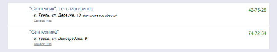 На «Деловой Твери» тоже есть парочка нововведений. Если у организации несколько адресов, то в рубрике у нее теперь есть ссылка «показать все адреса». Соответственно, при просмотре рубрики легче ориентироваться, хорошо видны сетевики. Согласно статистике пользователи восприняли это нововведение весьма благожелательно и лихо давят ссылку.